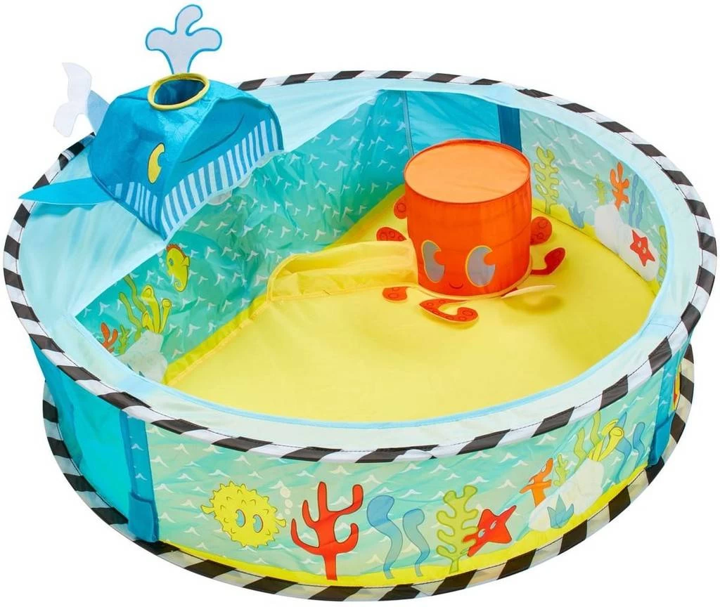 Deze Oceaan-ballenbak met walvis-ballenschieter zit vol leuke verrassingen voor uren speelplezier en ondersteunt bovendien de ontwikkeling van de hand-oogcoördinatie van baby’s. Deze ballenbak beschikt over 3 speelballen, een krab die ballen lanceert en een walvis-ballenfontein voor urenlang speelplezier met vriendjes. Of ze nu plezier maken in huis of spelen in de tuin, pret is gegarandeerd. Afmetingen: 20 cm hoog, 80 cm breed, 80 cm diep. Vanaf 9 maanden.