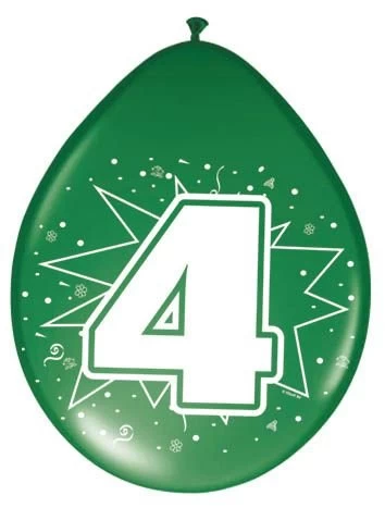 Deze ballonnen met het cijfer 4 erop zijn per 8 stuks verpakt. Deze ballonnen zijn alleen geschikt voor luchtvulling en in dit zakje zitten verschillende kleuren ballonnen.
