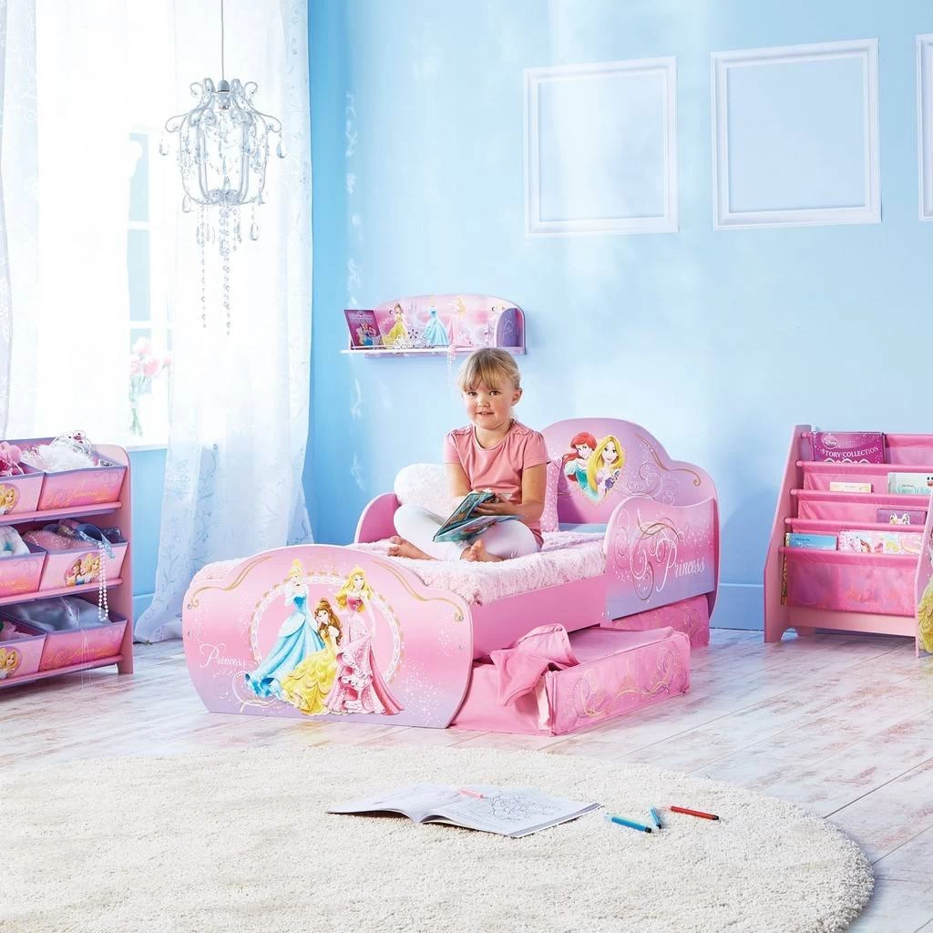 Dit peuterbed van Disney Princess is geschikt voor kinderen vanaf ongeveer drie jaar oud. Dit bed is extra veilig voor peuters omdat er aan de zijkant van het bed twee extra panelen bevestigd zijn zodat het kind er niet uit kan vallen tijdens de nacht. Onder het bed bevinden zich twee extra lade waar spullen in opgeborgen kunnen worden. Het matras en andere accessoires zijn niet inbegrepen. Het matras heeft de volgende afmetingen: 143x77x43.