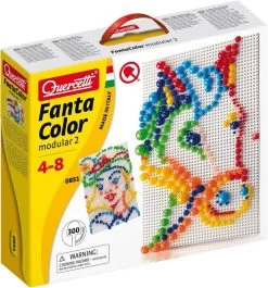 Quercetti Fantacolor Modular 2. Ontwerp de mooiste figuren door de kleurrijke pinnen op de juiste plek in het bord te drukken. Kinderen ontwikkelen hiermee hun oog-handcoördinatie en het herkennen van kleuren. Volg de ontwerpen uit het voorbeeldboek of laat jouw fantasie het werk doen.