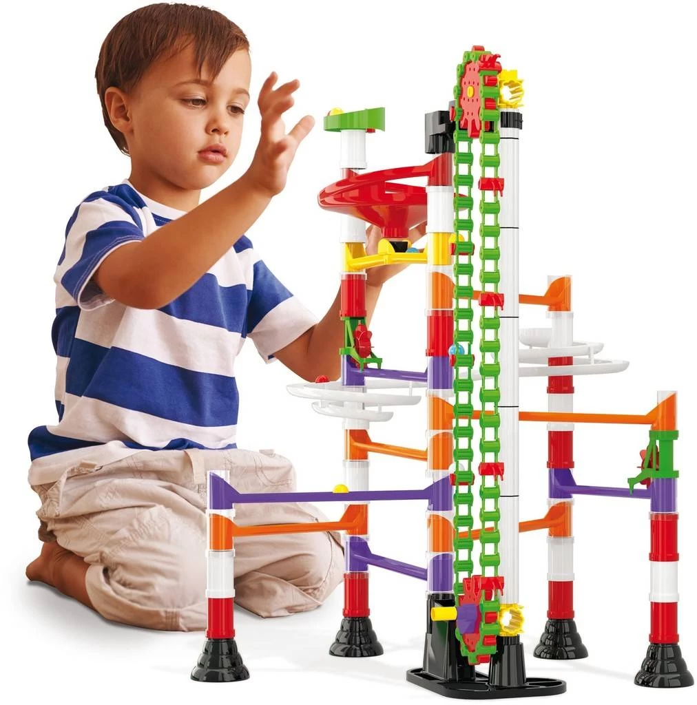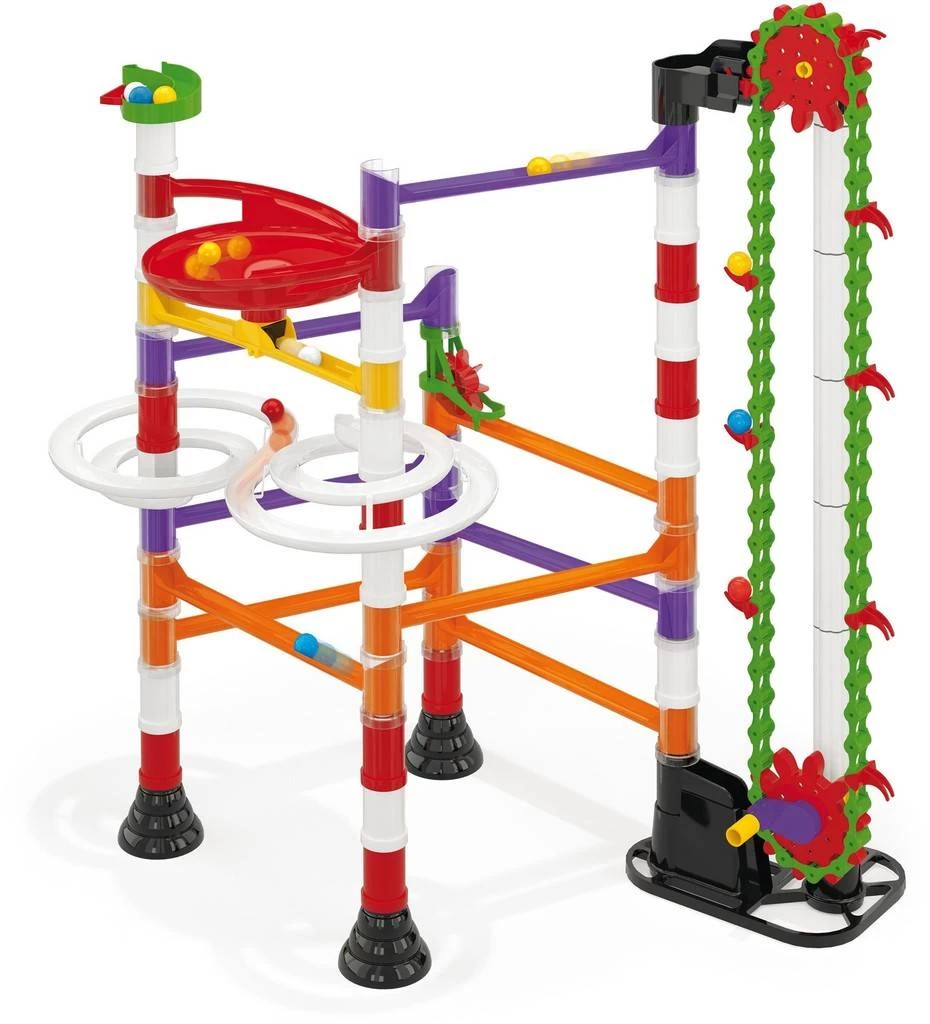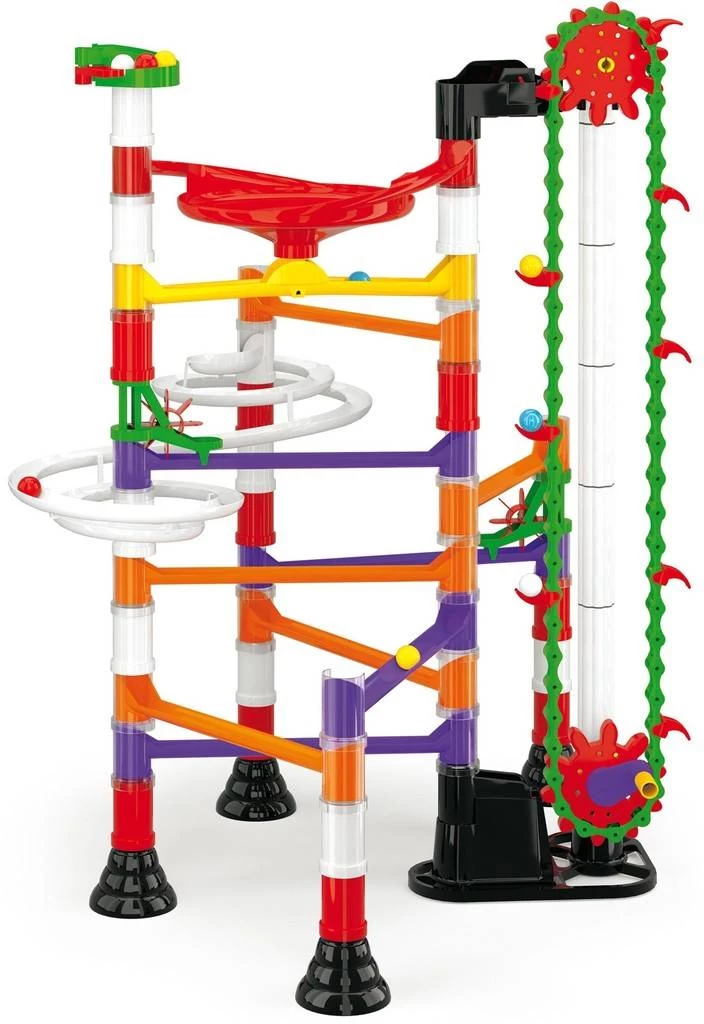 Deze Quercetti Migoga ‘Motor’ knikkerbaan is een mooie grote set, bestaande uit 150 onderdelen. Deze knikkerbaan bevat een liftje die met de hand te bedienen is en op deze manier kun je knikkers die uitgerold zijn direct weer omhoog sturen, om vervolgens weer naar beneden te rollen door een uitgebreid doolhof van spiralen, tunnels, trechters en nog veel meer. Kinderen kunnen hun eigen combinaties maken of de voorbeelden volgen die op de doos staan afgebeeld. Alle onderdelen passen gemakkelijk in eindeloze combinaties, deze knikkerbaan staat dus garant voor uren speelplezier. Inclusief knikkers en een instructieboekje. Geschikt voor kinderen vanaf 5 jaar.