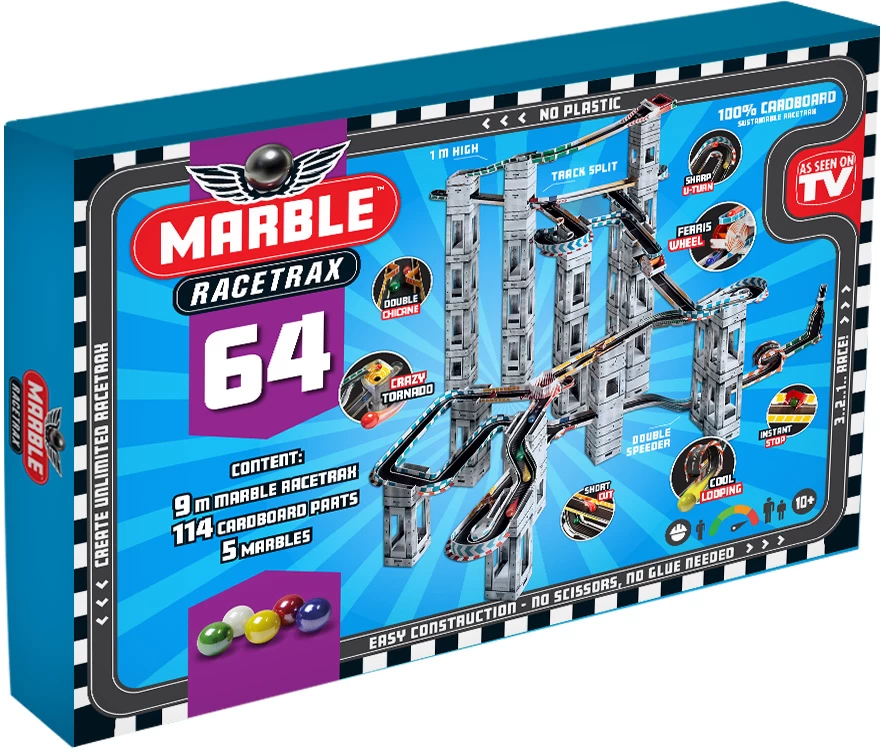 Haal nu deze toffe Marble Racetrax knikkerbaan, bekend van televisieprogramma Marble Mania, zelf in huis! Bouw de ultieme Marble Racetrax knikkerbaan met deze nieuwe set. Deze racebanen zijn eenvoudig te bouwen en de kinderen zullen een ontploffing hebben in het verkennen van fysica en dynamiek, terwijl ze bouwen aan een geweldige knikkerbaan met veel plezier. De knikkerbaan is gemaakt van stevig karton en is 9 meter lang, bevat 64 vellen waarvan 114 kartonnen onderdelen gemaakt worden. Laat je fantasie de vrije loop en creëer toffe stunts en obstakels.