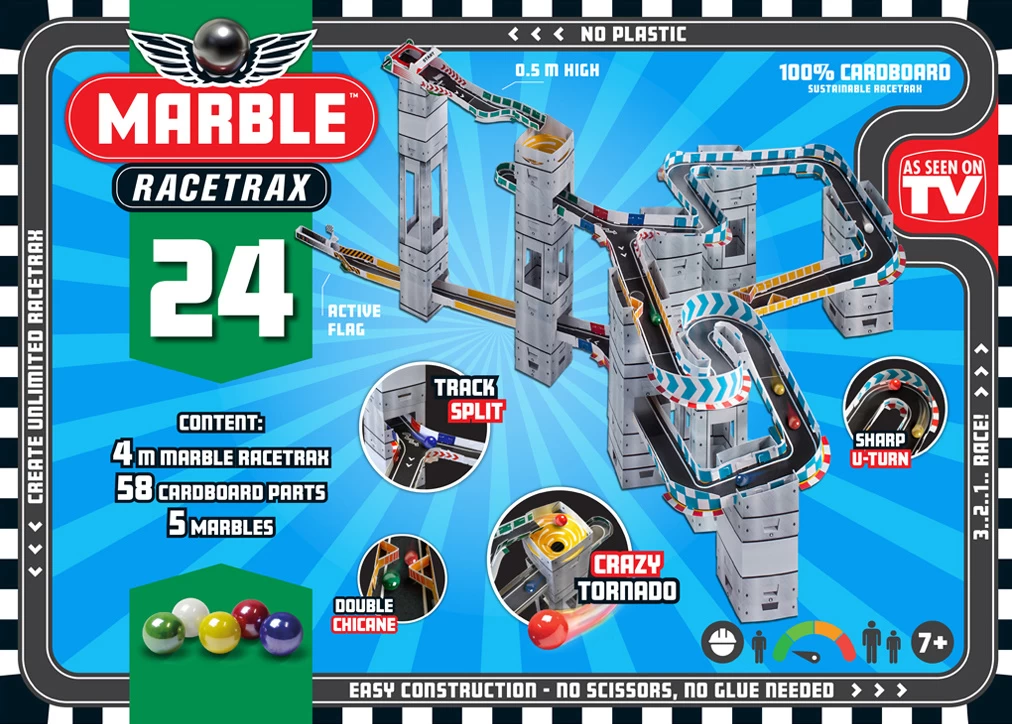 Haal nu deze toffe Marble Racetrax knikkerbaan, bekend van televisieprogramma Marble Mania, zelf in huis! Bouw de ultieme Marble Racetrax knikkerbaan met deze nieuwe set. Deze racebanen zijn eenvoudig te bouwen en de kinderen zullen een ontploffing hebben in het verkennen van fysica en dynamiek, terwijl ze bouwen aan een geweldige knikkerbaan met veel plezier. De knikkerbaan is gemaakt van stevig karton en is 4 meter lang, bevat 24 vellen waarvan 58 kartonnen onderdelen gemaakt worden. Laat je fantasie de vrije loop en creëer toffe stunts en obstakels.