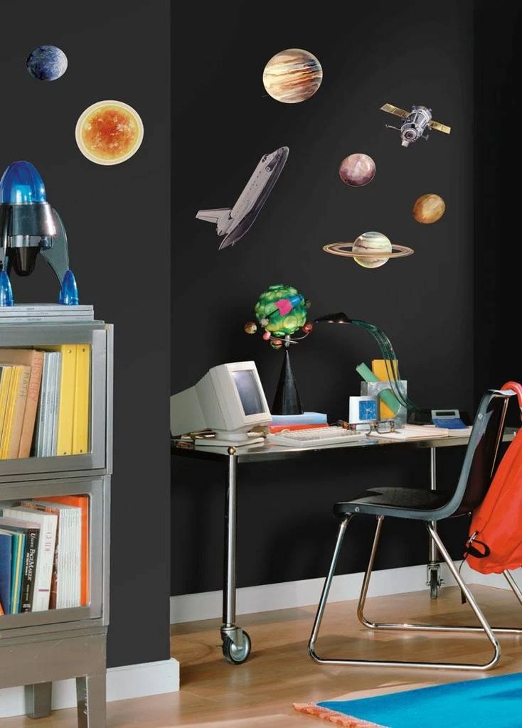 Het heelal komt zo je kamer ingestormd met de Space Travel muurstickers . Zonnen, sterren, planeten, satelieten zijn afgebeeld op deze muurstickers. RoomMates muurstickers worden in de VS vervaardigd van een hoogwaardig dun en flexibel vinyl. Veelgestelde vragen over de muurstickers: 1. Op welke ondergrond kunnen RoomMates muurstickers aangebracht worden? Op een vlakke niet vette en niet zuigende ondergrond die minstens 3-4 weken geleden geschilderd is. Als een muur te poreus is dan dient deze getext te worden omdat anders de sticker teveel vocht onttrekt uit de muur en snel los kan laten. 2. Hoe kan ik RoomMates muurstickers makkelijk verwijderen? Met behulp van een föhn zijn vrijwel alle stickers prima te verwijderen. Let op dat de ondergrond zoals glas niet te heet wordt! 3. Zijn de RoomMates muurstickers herbruikbaar? RoomMates Muurstickers zijn, mits volgens de gebruiksaanwijzing aangebracht, telkens weer opnieuw te verwijderen en weer te hergebruiken.