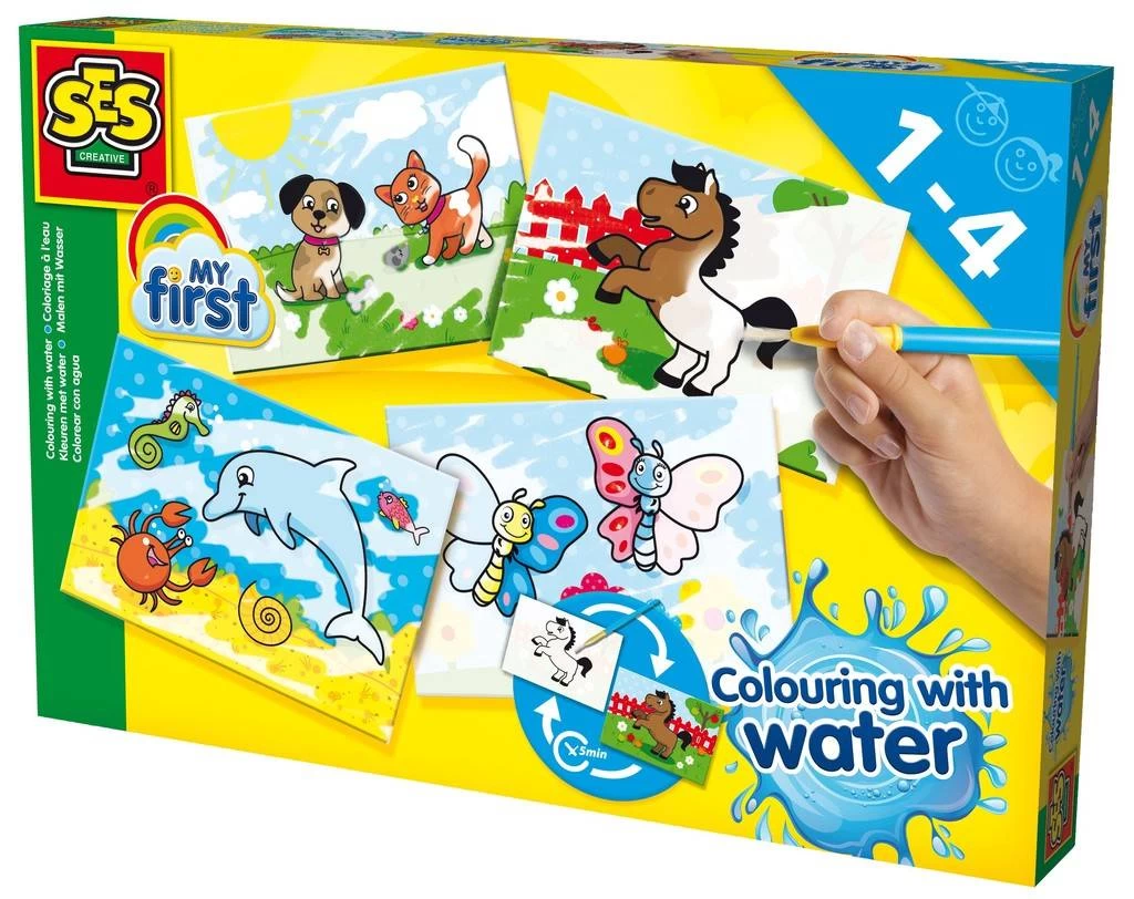 Magie met water en verven zonder geknoei! Dat kan met deze unieke set van SES. Ga met een natte kwast over de voorbedrukte kaarten en zie hoe de kleurplaat zichtbaar wordt. De kwast is veilig te gebruiken, omdat de haren niet kunnen uitvallen. Na opdrogen steeds opnieuw te gebruiken.