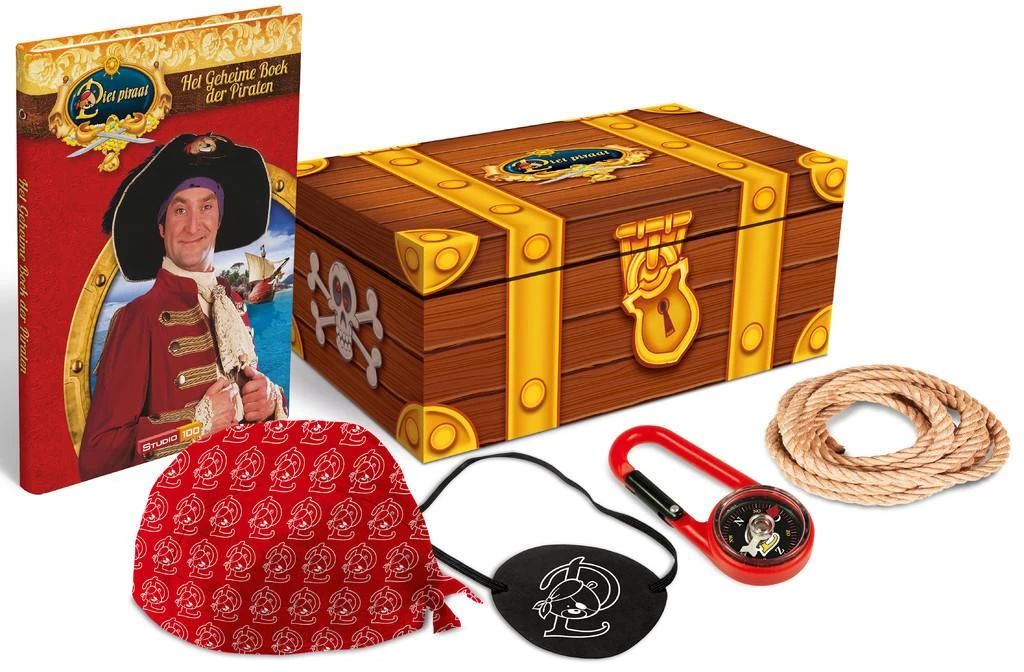 In deze schatkist van Piet Piraat vind je alles om een echte piraat te worden. Trek de stoere bandana aan, zet als een heldhaftige zeebonk het ooglapje op, leer knopen leggen met een echt scheepstouw, word een held in kaartlezen en ontdek een boek vol piratengeheimen. Vanaf nu wijst het magische kompas je altijd de weg naar de leukste en spannendste avonturen. Zeil mee met Piet Piraat en zijn kornuiten over de zeven zeeën als een echte piraat.