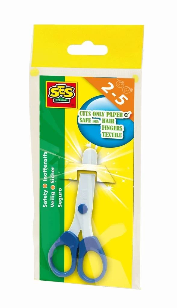 Veiligheidsschaar van SES. Veilig voor vingers, haar en textiel. Knipt alleen papier! Zo kun je veilig met een schaar leren omgaan.