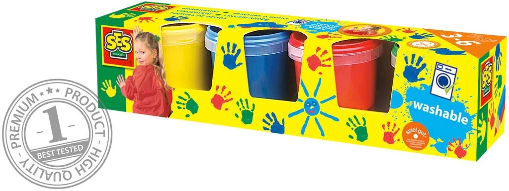 Lekker kliederen en kleuren met deze vingerverfset van SES. Maak de mooiste schilderijen! In deze set vind je vier potjes verf in de kleuren blauw, rood, geel en groen. Heb je per ongeluk geknoeid op je kleren? Geen probleem, de verf is uitwasbaar. Verder is deze verf glutenvrij.