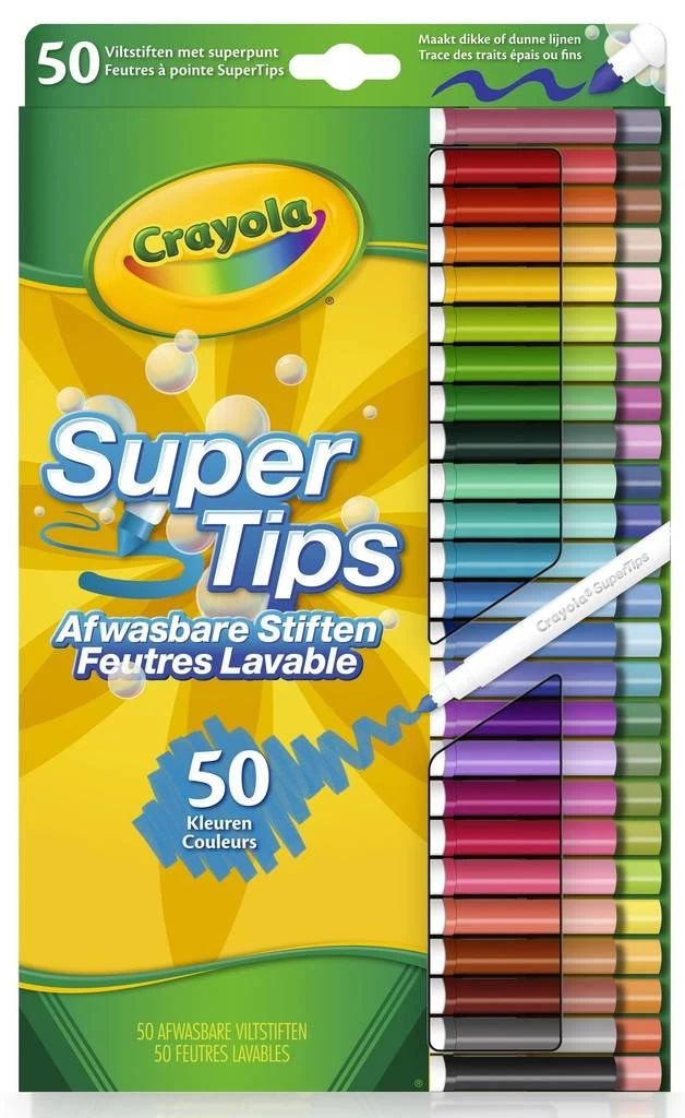 Hoge kwaliteit viltstiften van Crayola. De stiftpunten zijn niet eenvoudig weg te drukken. Daarnaast zijn deze punten geschikt om zowel dunne als dikke lijnen te maken. Ideaal voor tekenen, schrijven en inkleuren. De inkt van deze viltstiften is gemakkelijk afwasbaar van huid en kleding. In deze verpakking zitten maar liefst vijftig verschillende kleuren. Geschikt voor kinderen vanaf 3 jaar.